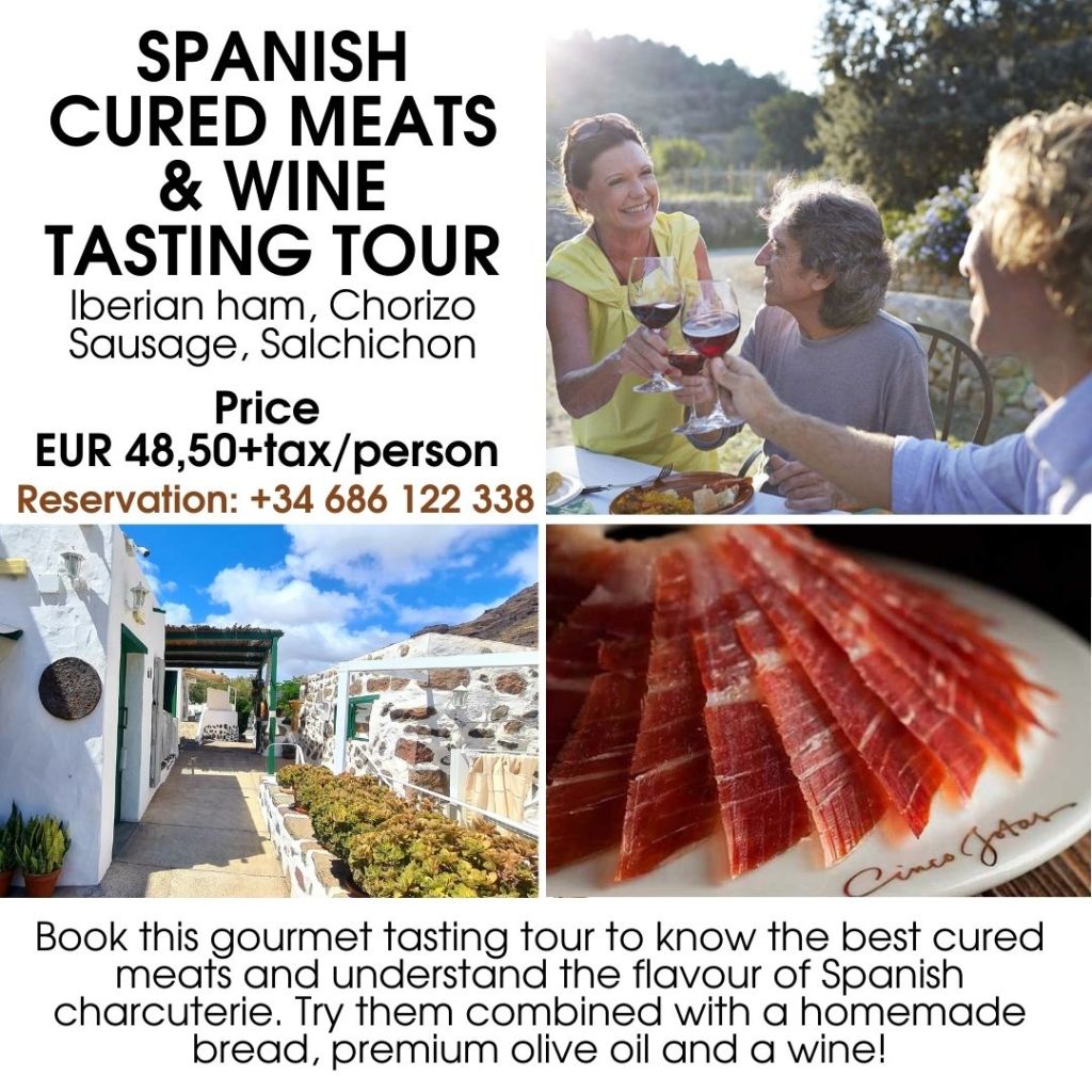 As part of the Cured Meats tasting you will be invited to sample a selection of meats such as the: Iberian ham, Chorizo Sausage, Salchichon. You will learn about the production of very famous ham «5 Jotas».